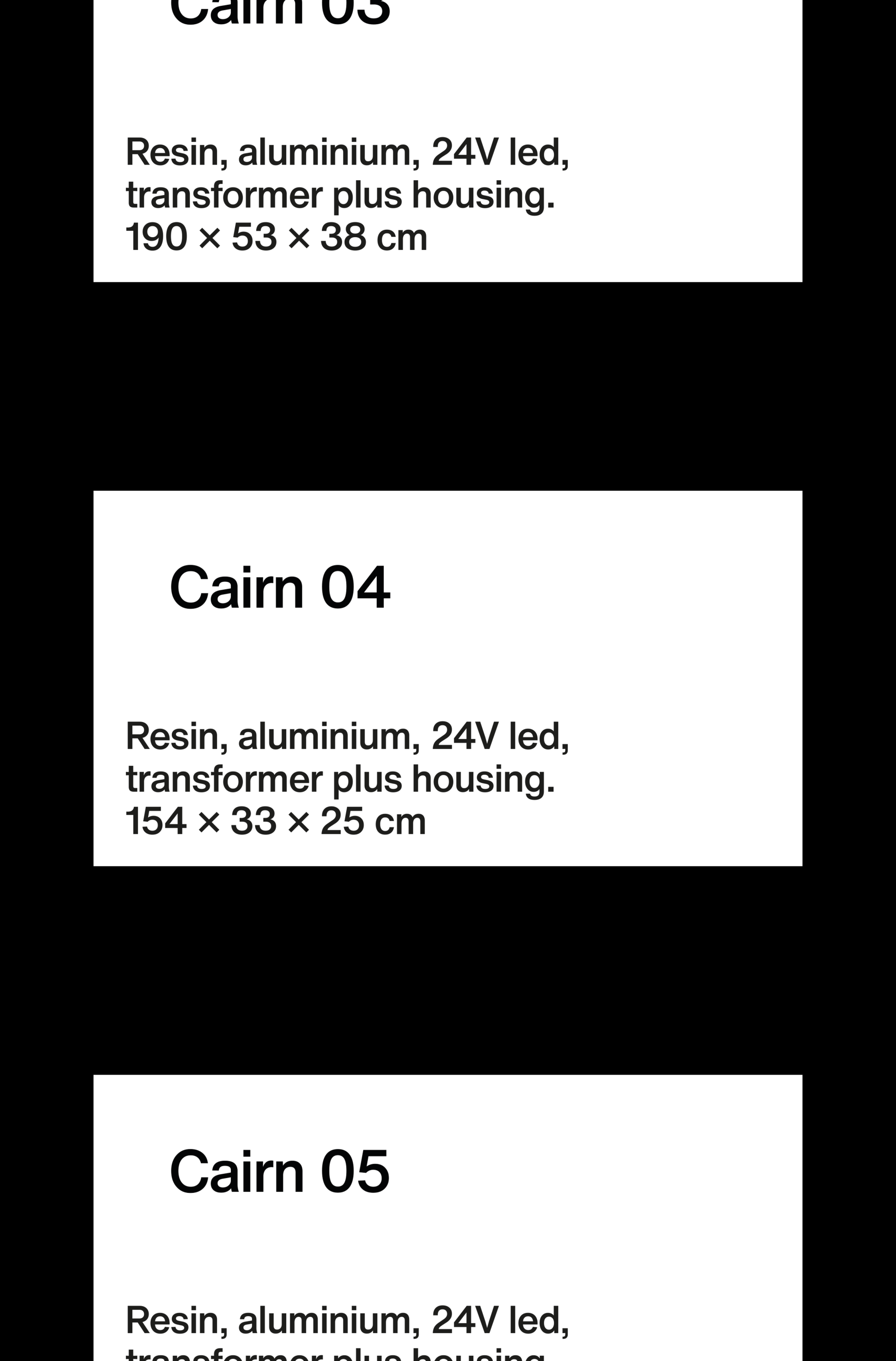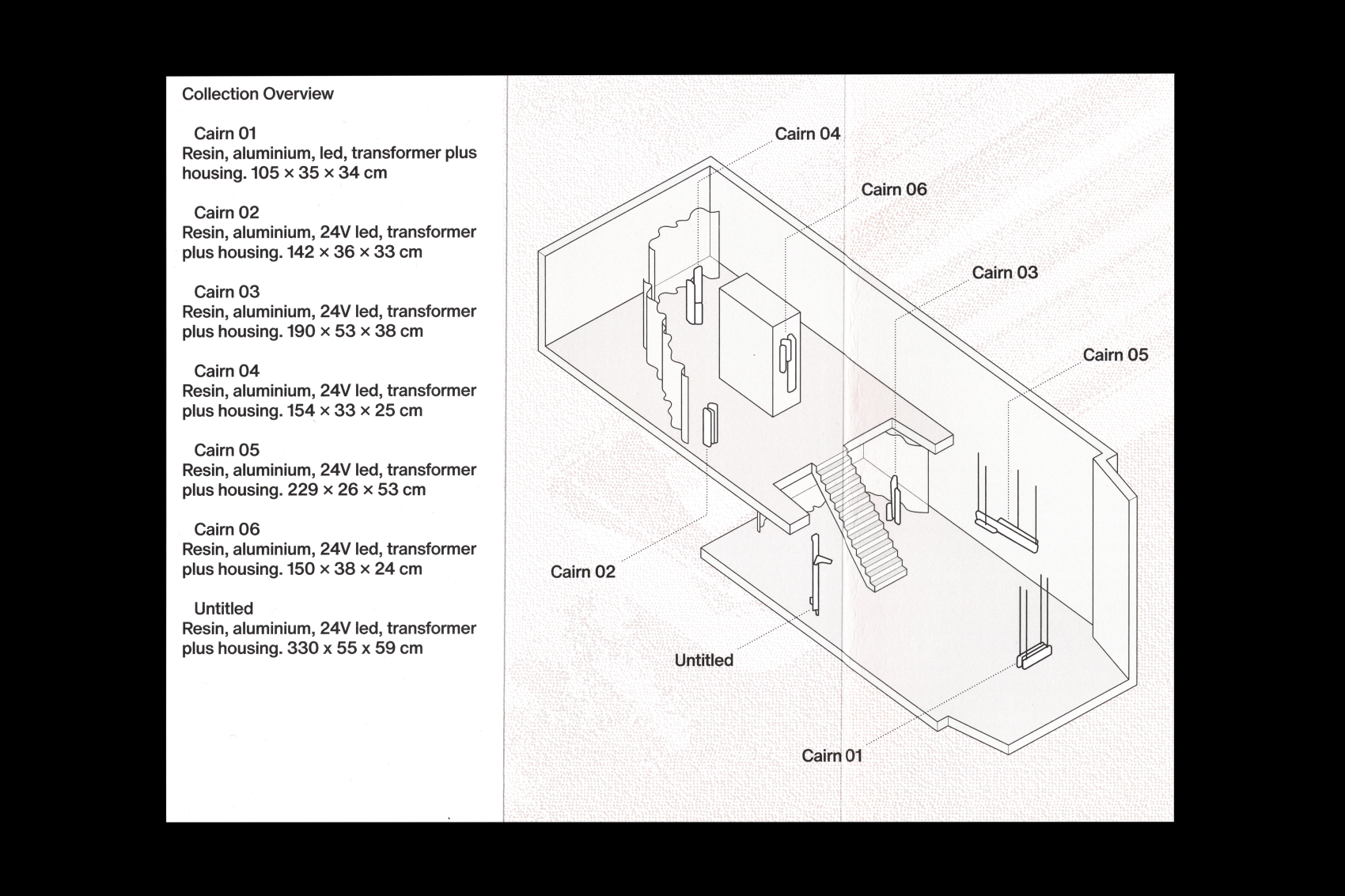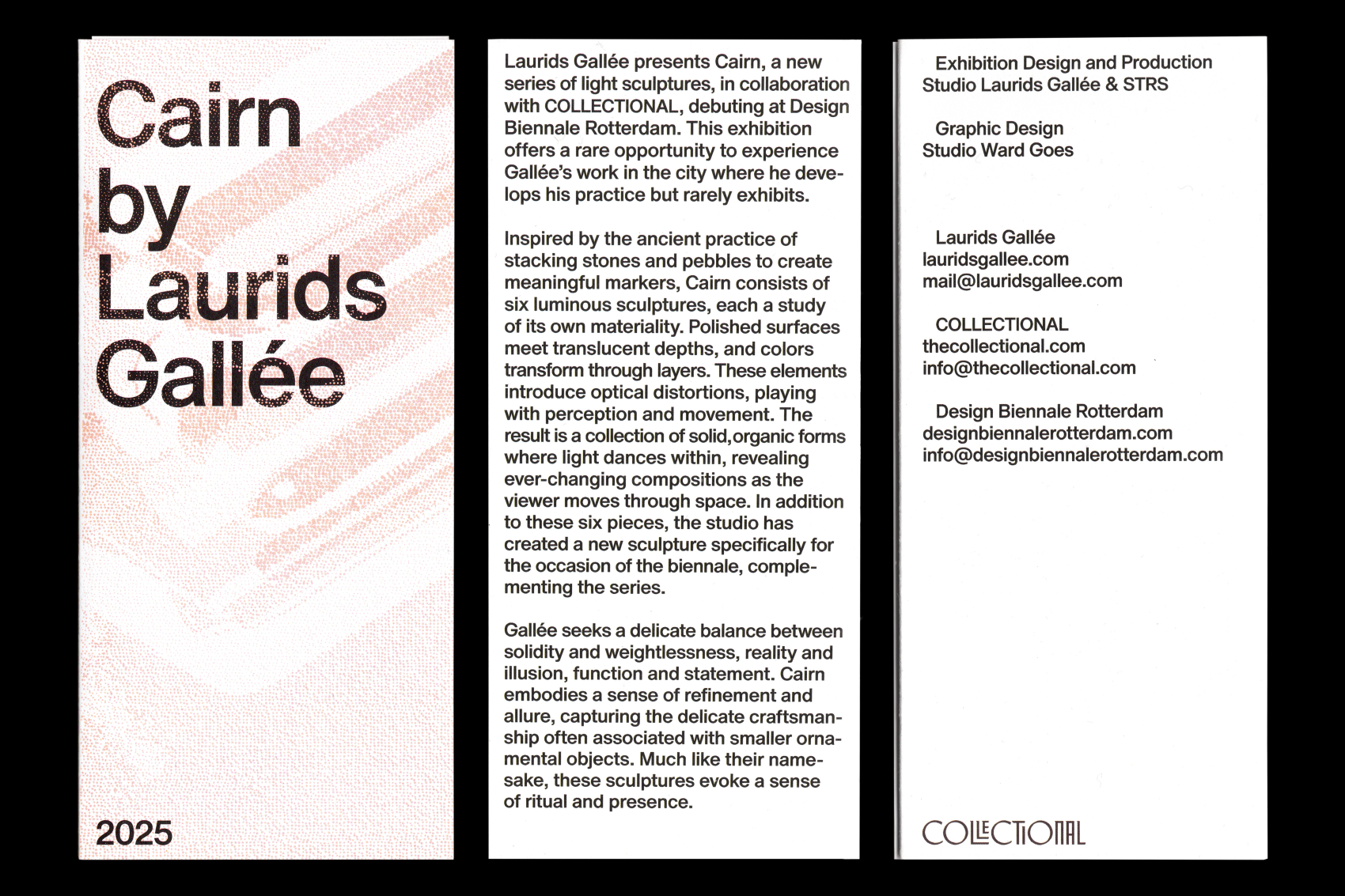 Visual identity and exhibition assets for “Cairn,” a solo exhibition by Laurids Gallée in collaboration with Gallery Collectional during the inaugural Design Biennale Rotterdam. The exhibition presents seven light sculptures that explore how light interacts with transparent materials and their surface treatment.