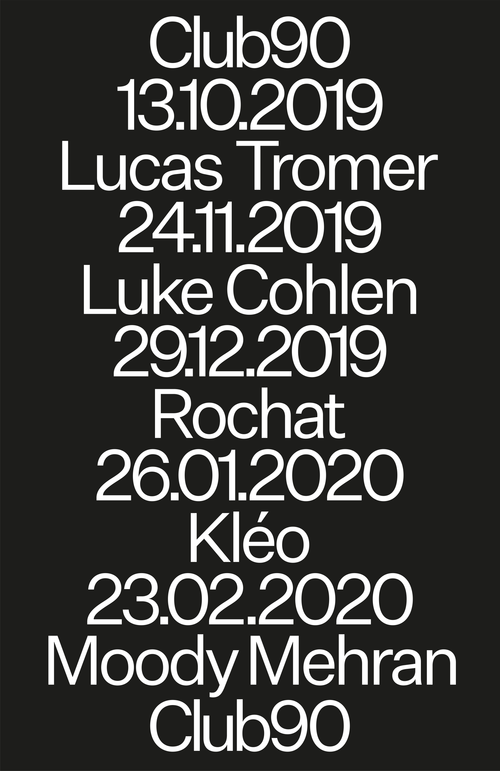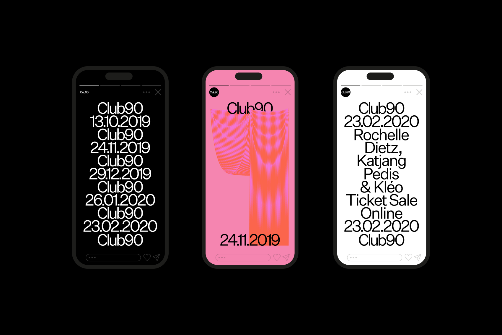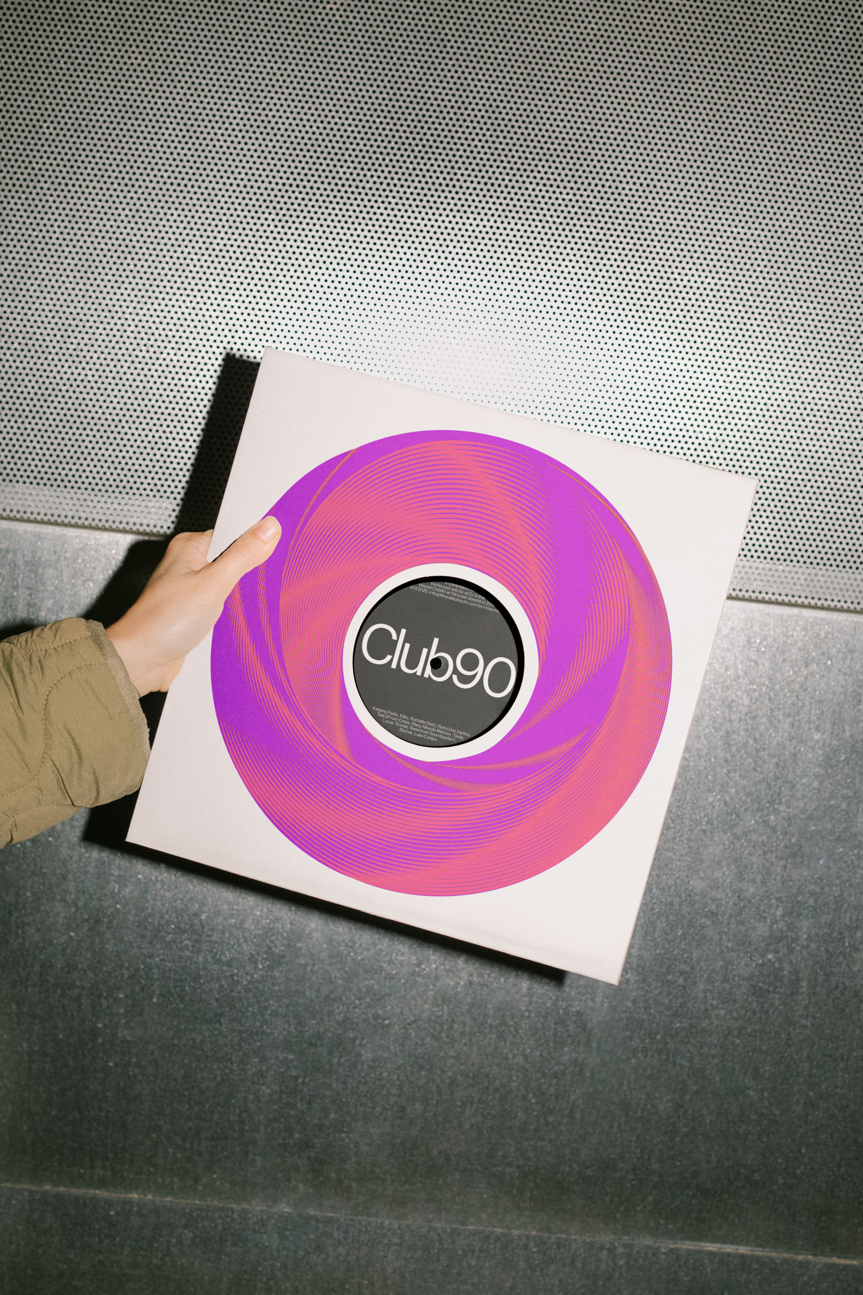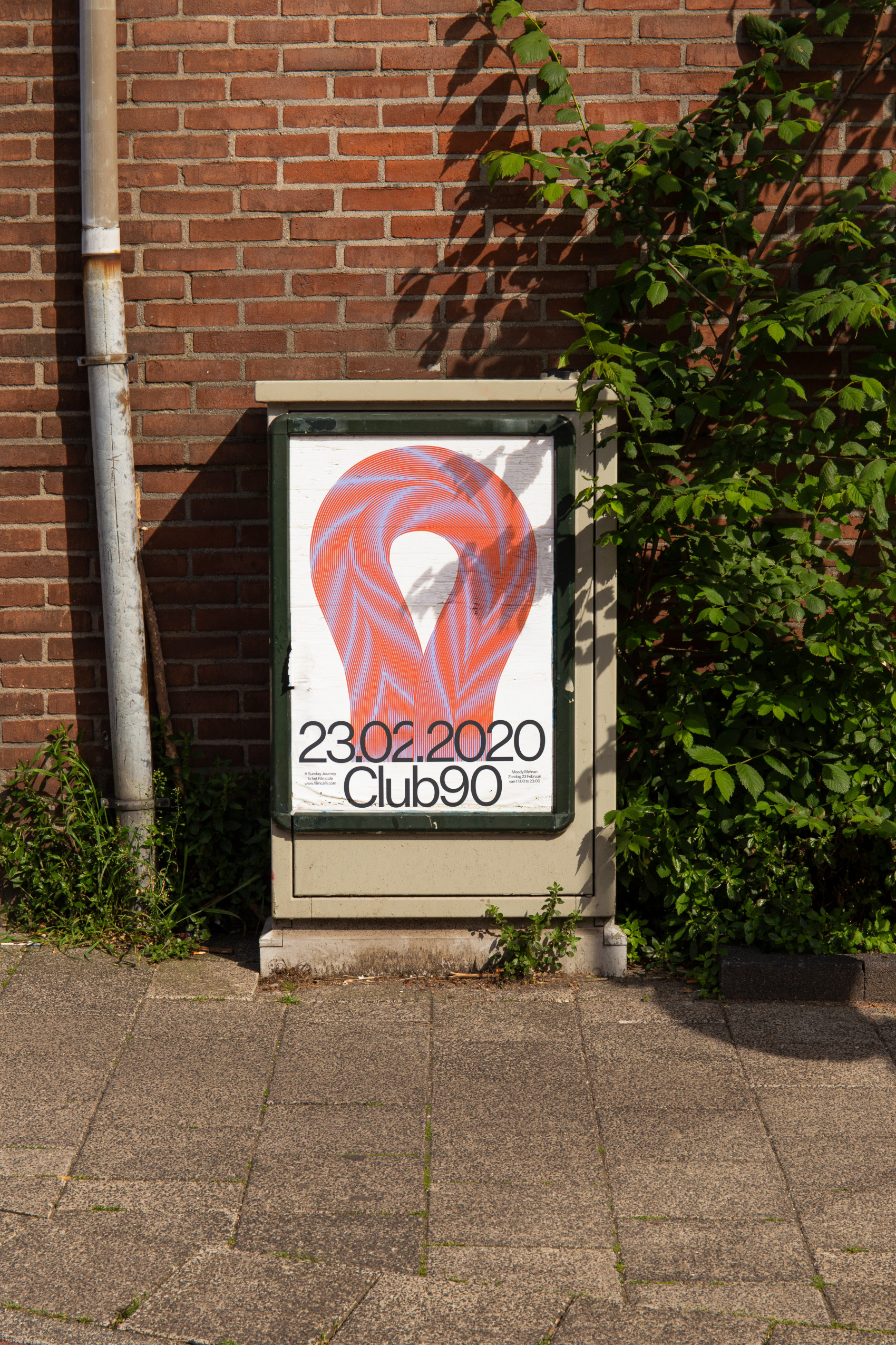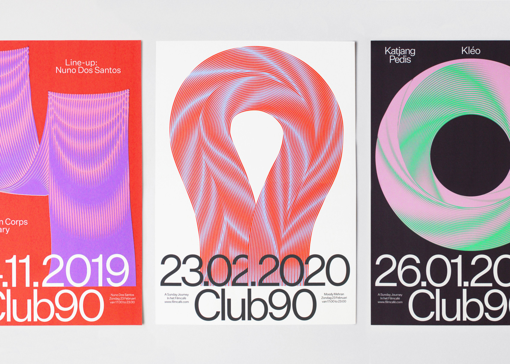 Visual identity and art direction for Club90, a Utrecht-based pop-up music venue hosting monthly house and dance events at Filmcafé Utrecht. The identity combines clear typography and minimalist layouts with bold, evolving shapes and colours that change for each event, reflecting the dynamic and playful spirit of the venue.