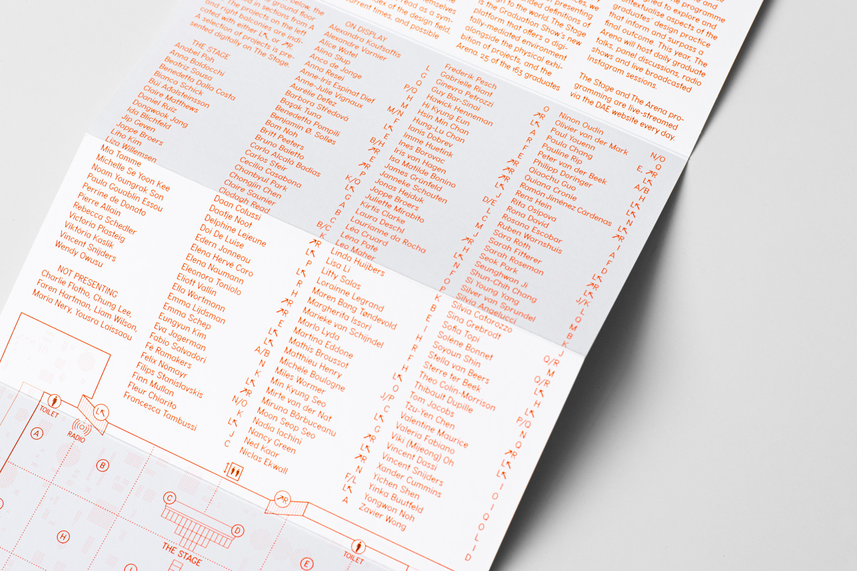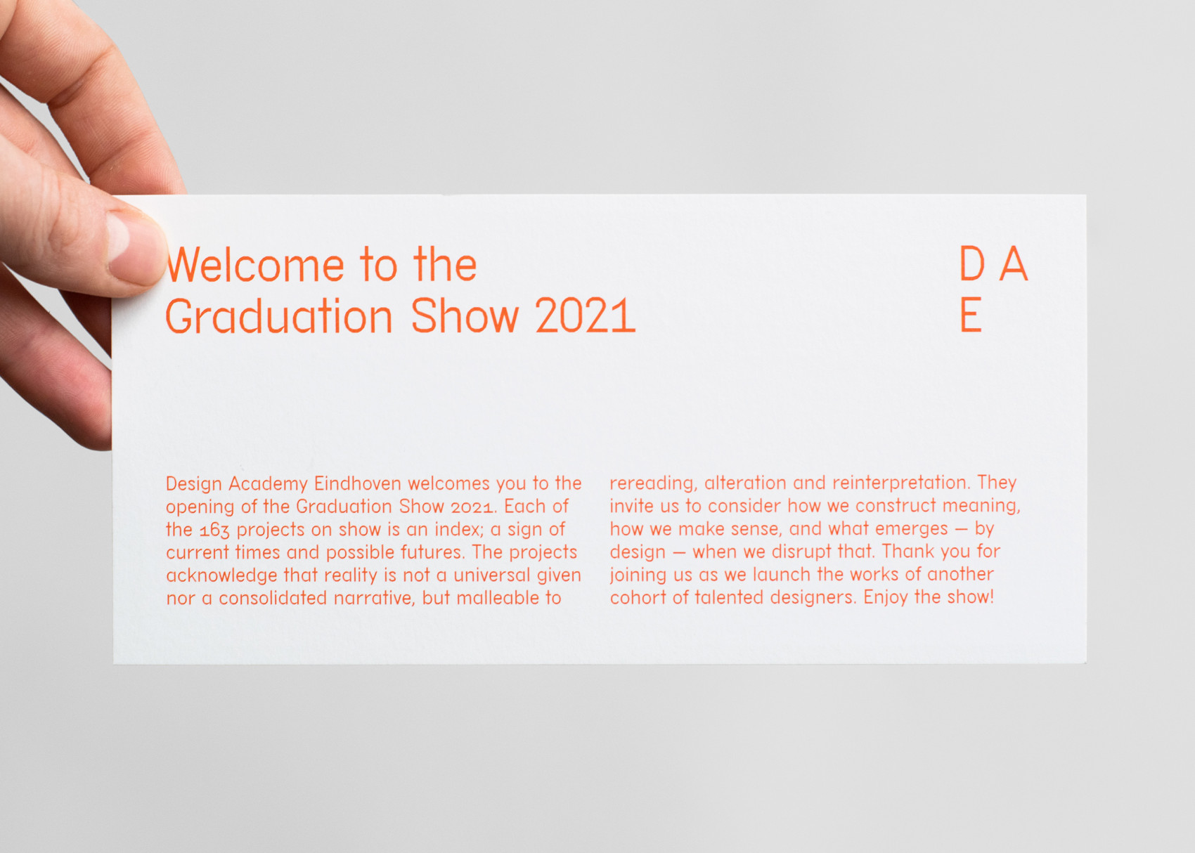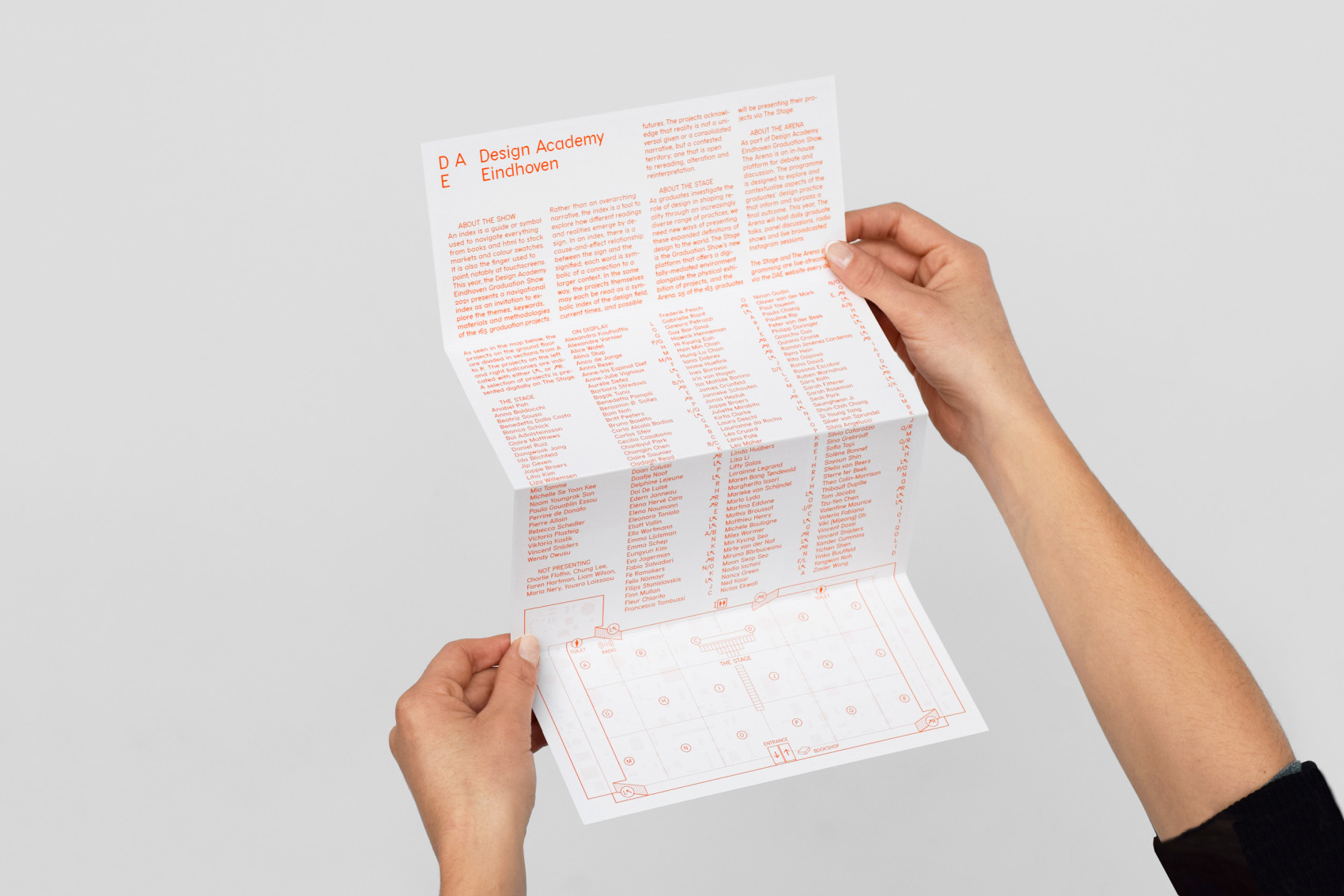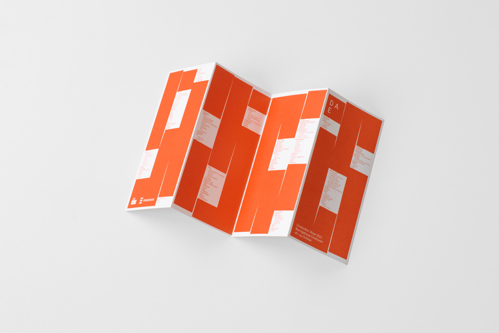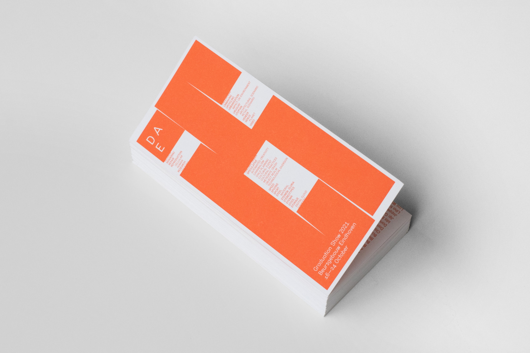 Visual identity and campaign design for the 2021 Design Academy Eindhoven Graduation Show during Dutch Design Week. An elaborate index compiled from project descriptions is used throughout the communication, offering glimpses of the conceptual framework. Inspired by paper-cutting, a second layer selectively reveals parts of the index, emphasizing the editorial process behind the show’s presentation.