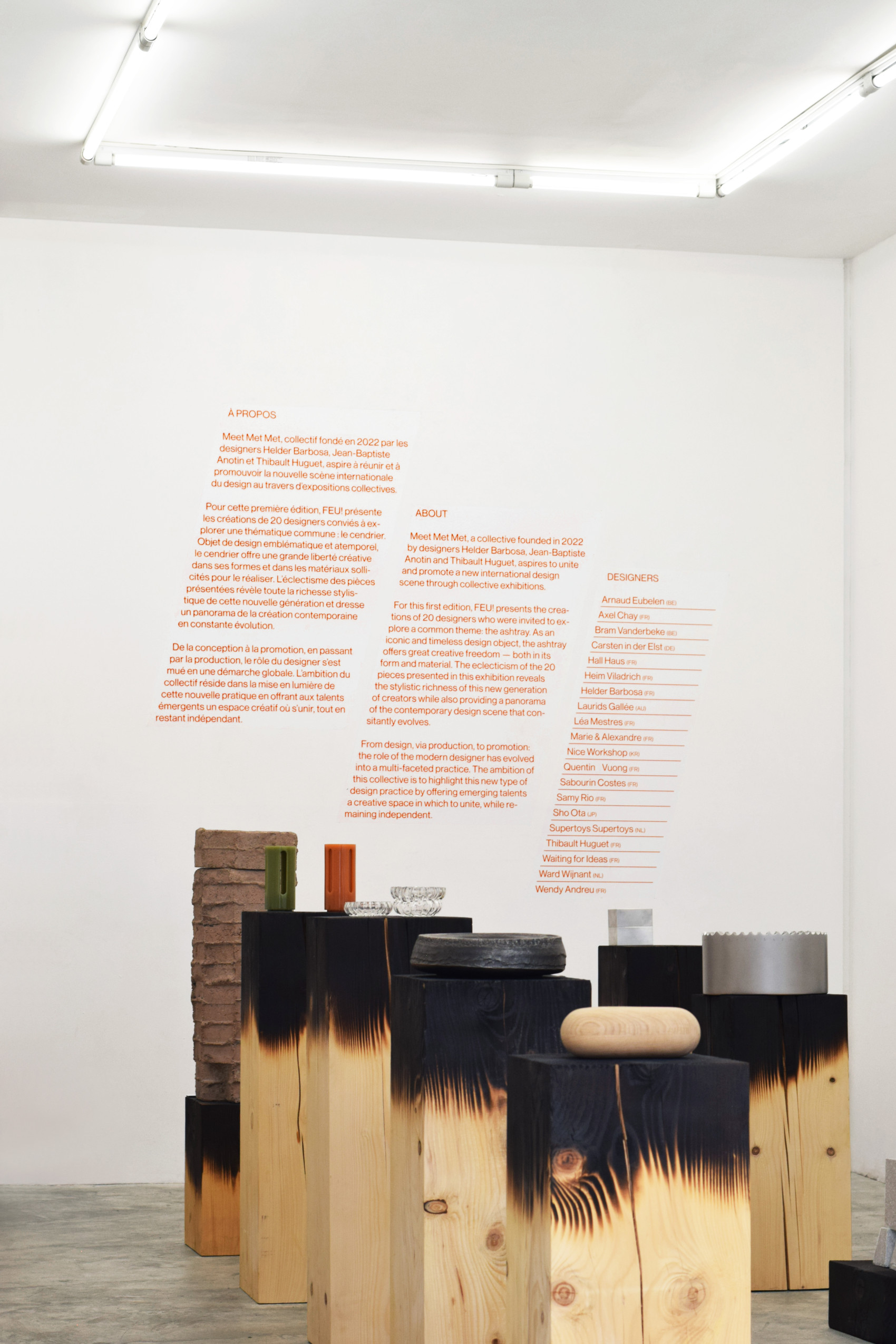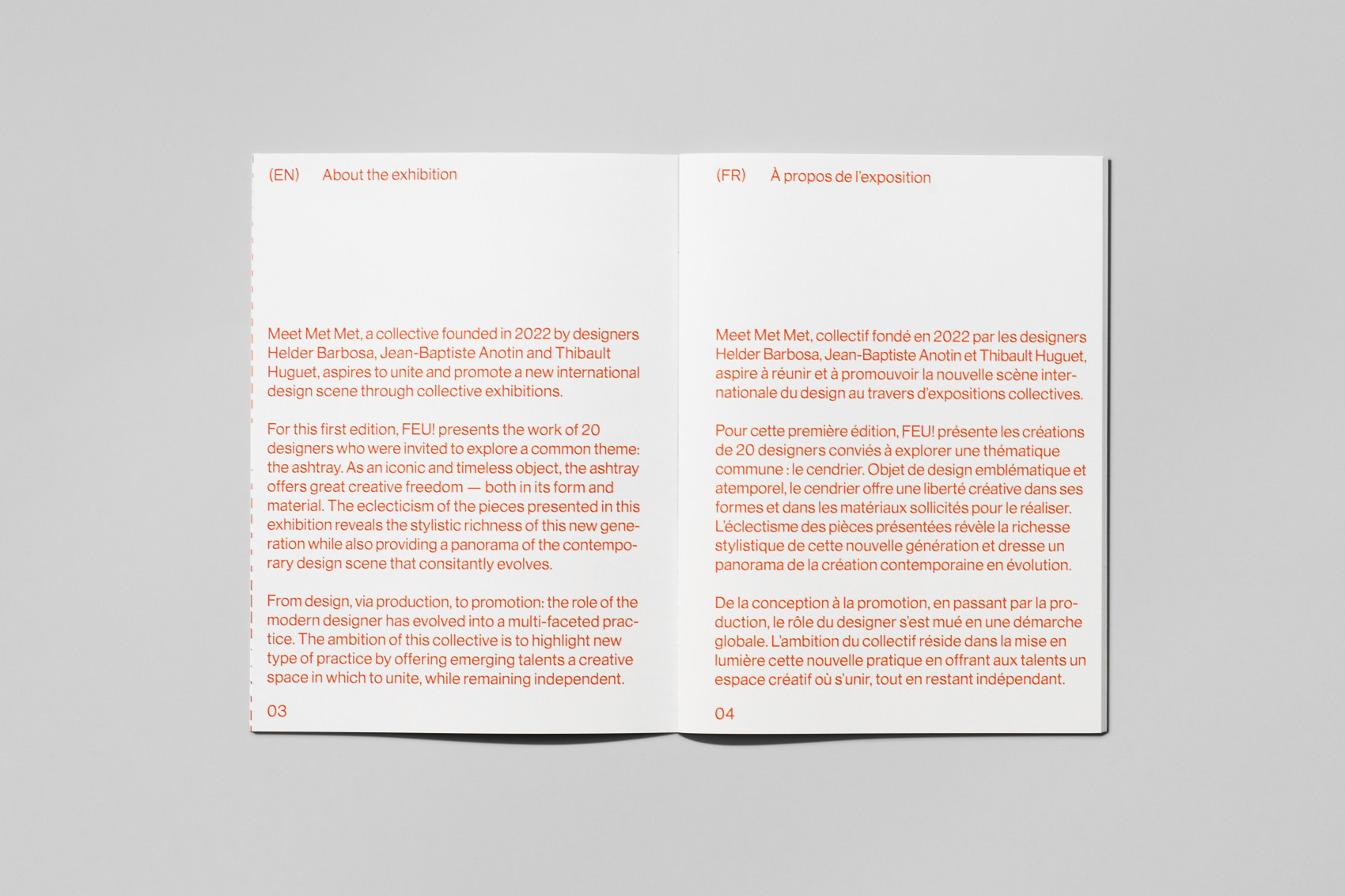 Graphic design and art direction for FEU!, a group exhibition organised by the design collective Meet Met Met during Paris Design Week 2023. The exhibition featured twenty emerging designers from France and abroad, each presenting their own interpretation of one of the most ambiguous design objects: the ashtray.