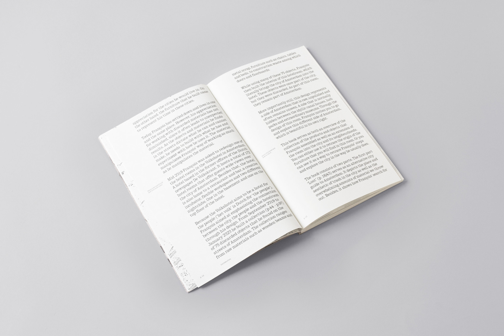 Book design documenting François Duquesnoy’s ‘special room’ at the Volkshotel in Amsterdam-East, a space created entirely from discarded materials found across the city. The project emphasizes the connection between the hotel and Amsterdam, offering visitors a way to experience the city through the lens of the room. The book retraces the origins of the furniture and objects, guiding readers through Duquesnoy’s creative process while revealing hidden corners and stories of the city.