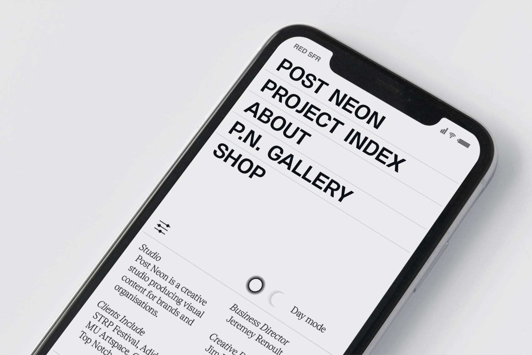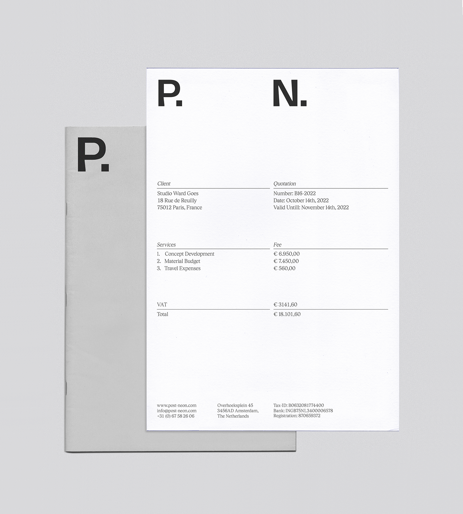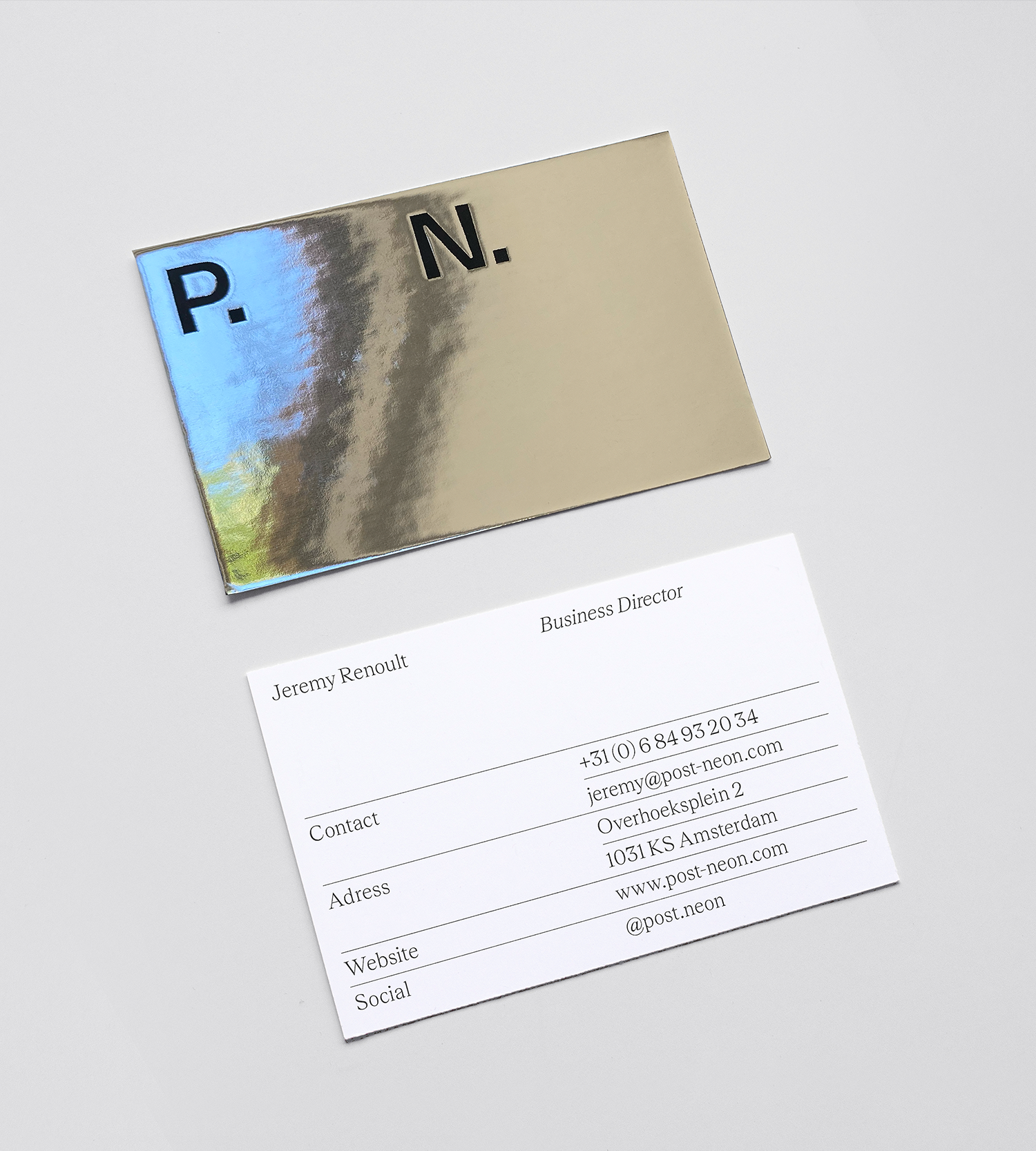 Visual identity and custom typeface for the Amsterdam-based creative studio Post Neon, specializing in 3D content for video and imagery. The typeface PN Display features angled lines and tapered verticals, and includes a logo that works both abbreviated as “P.N.” or fully as “Post Neon,” with spacing dynamically derived from the full logotype.