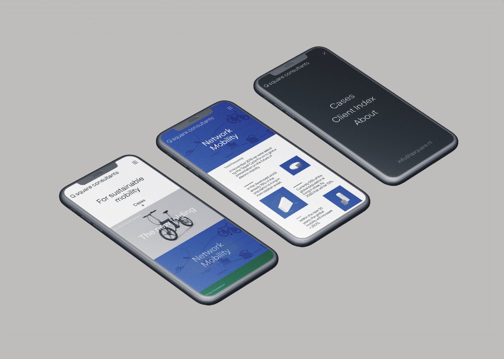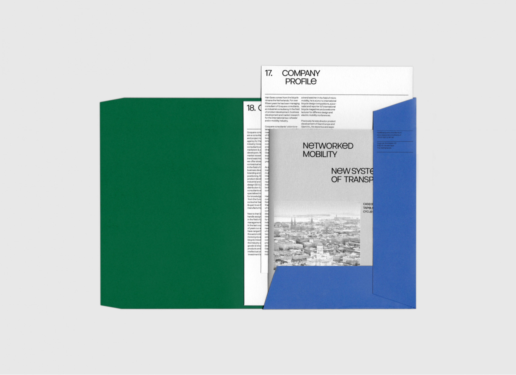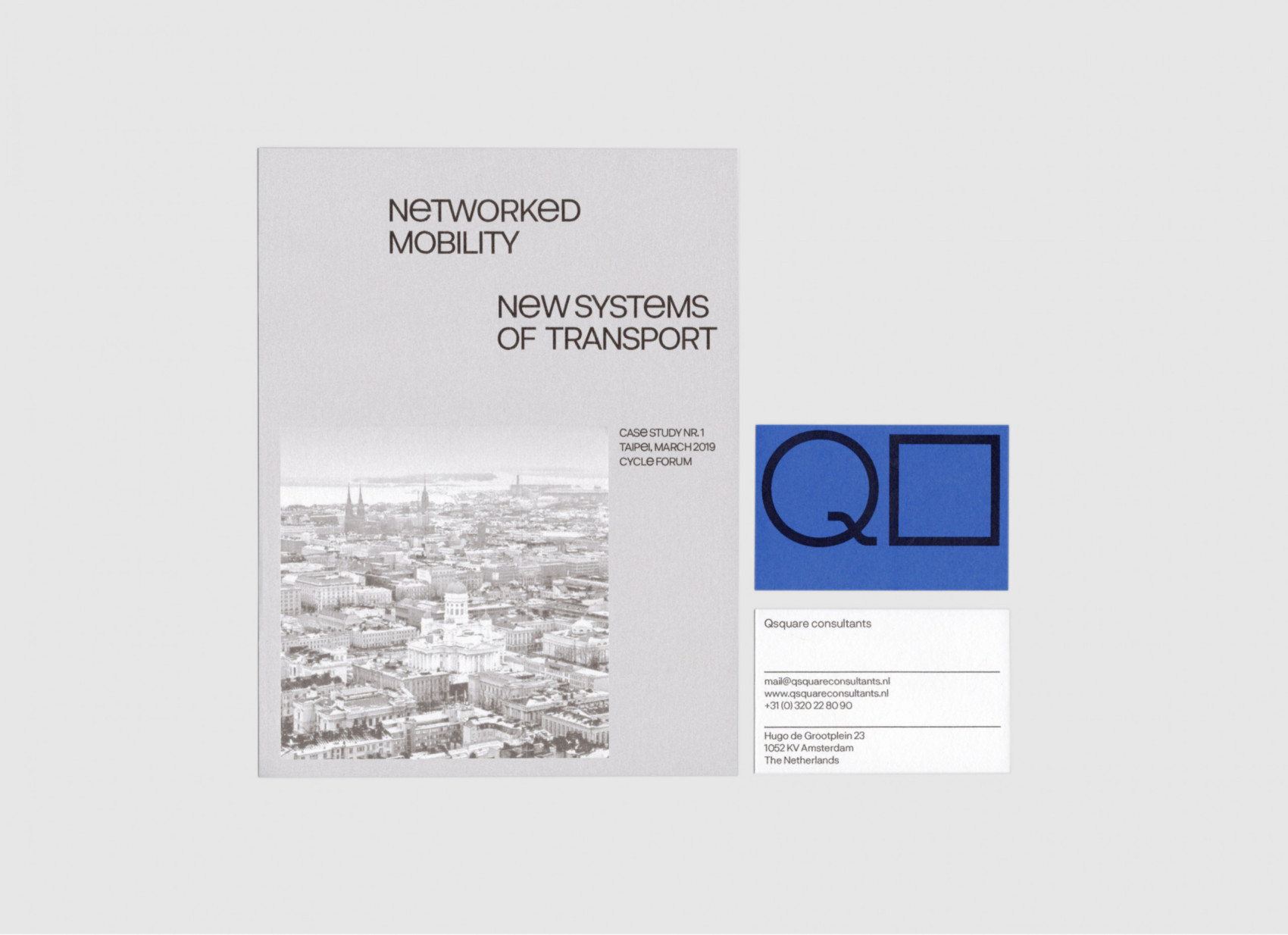Brand identity for Q Square Consultants, an agency with over thirty years of experience in the bicycle industry. Mobility and dynamism are expressed through the uneven use of upper- and lower-case letters, paired with a dynamic color palette, reflecting the agency’s consultancy across e-mobility and professional bike racing.