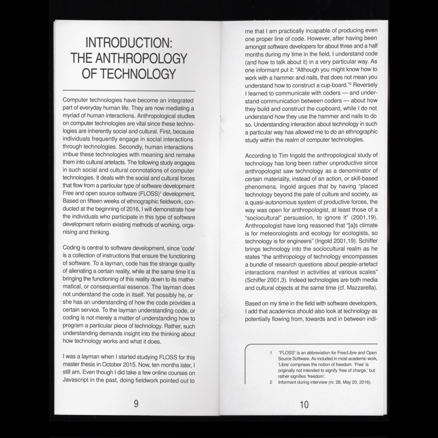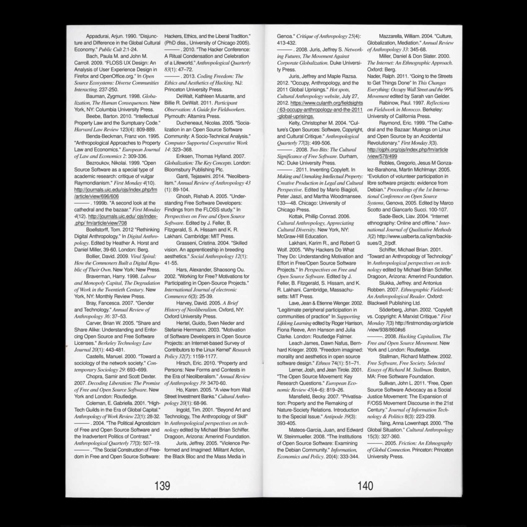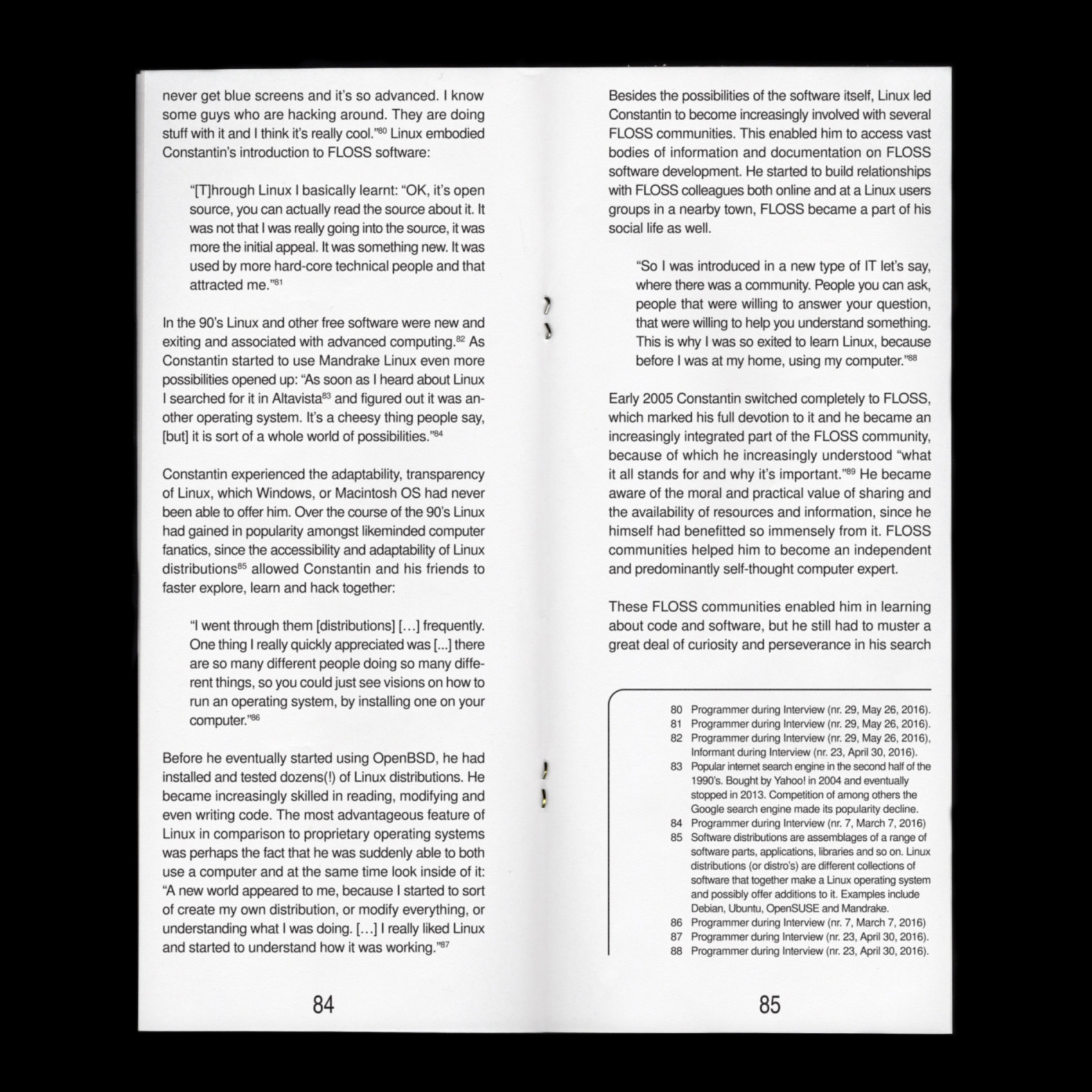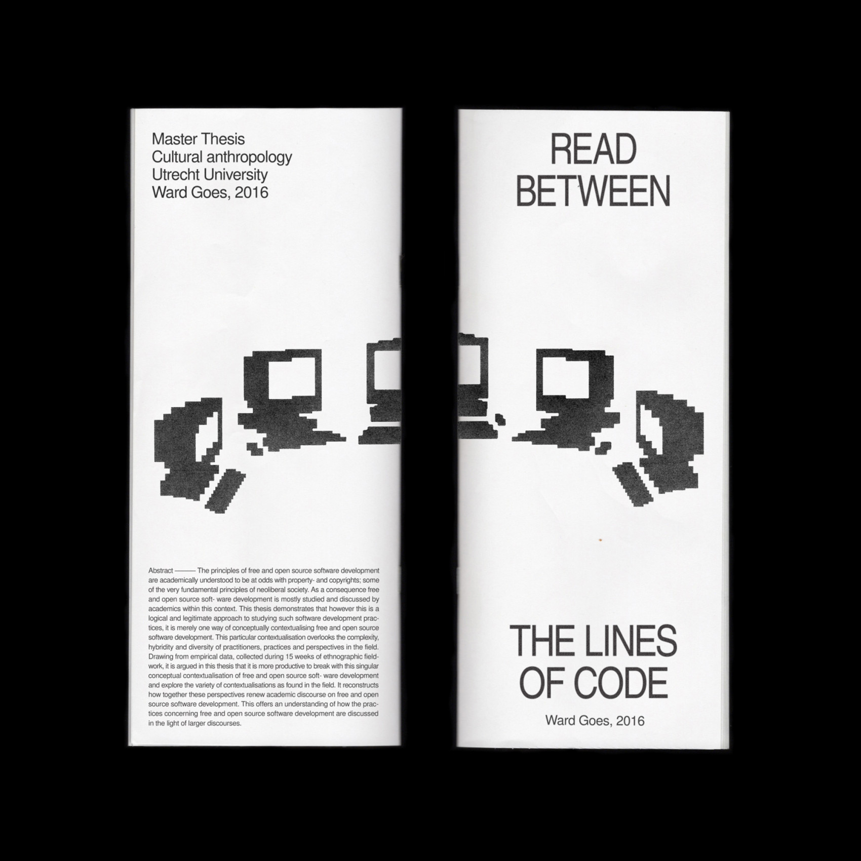 Thesis writing and book design for Read Between the Lines {of Code}, a thesis investigating how technological practices shape individual and communal learning. The project examines free and open source software development to reveal the inherently social and cultural dimensions of technology, highlighting flows between individuals and communities.