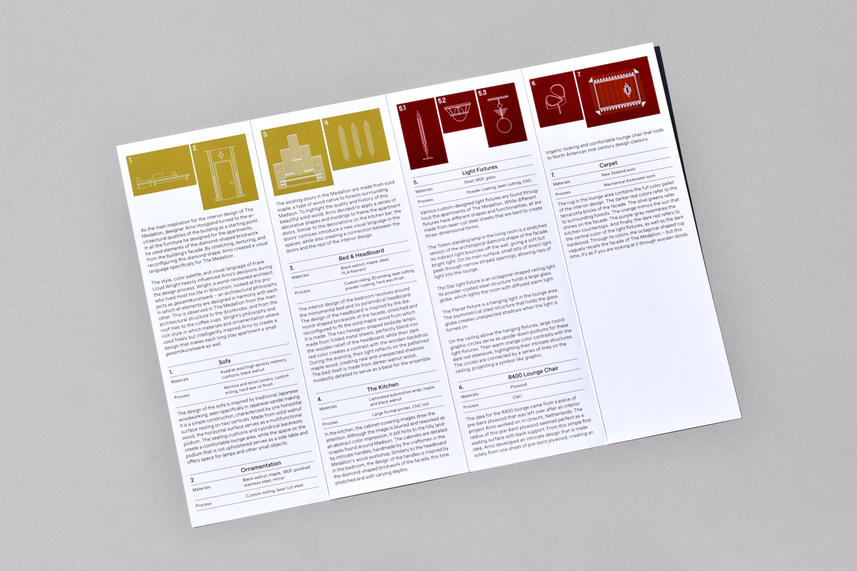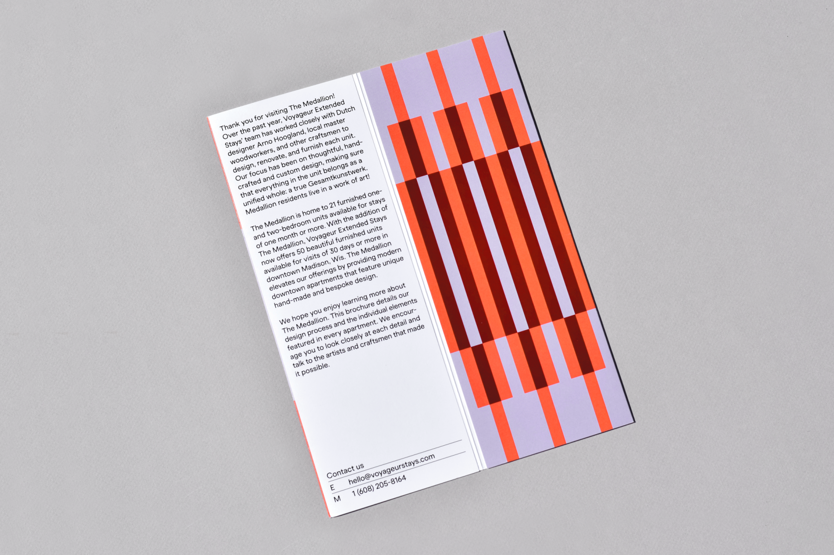 Brand identity for The Medallion, a high-end long-stay hotel in Madison, Wisconsin. The branding reflects the hotel’s bespoke interiors, quality materials, and sustainable production, drawing from the patterns and colours of the spaces to create a distinctive and refined identity.