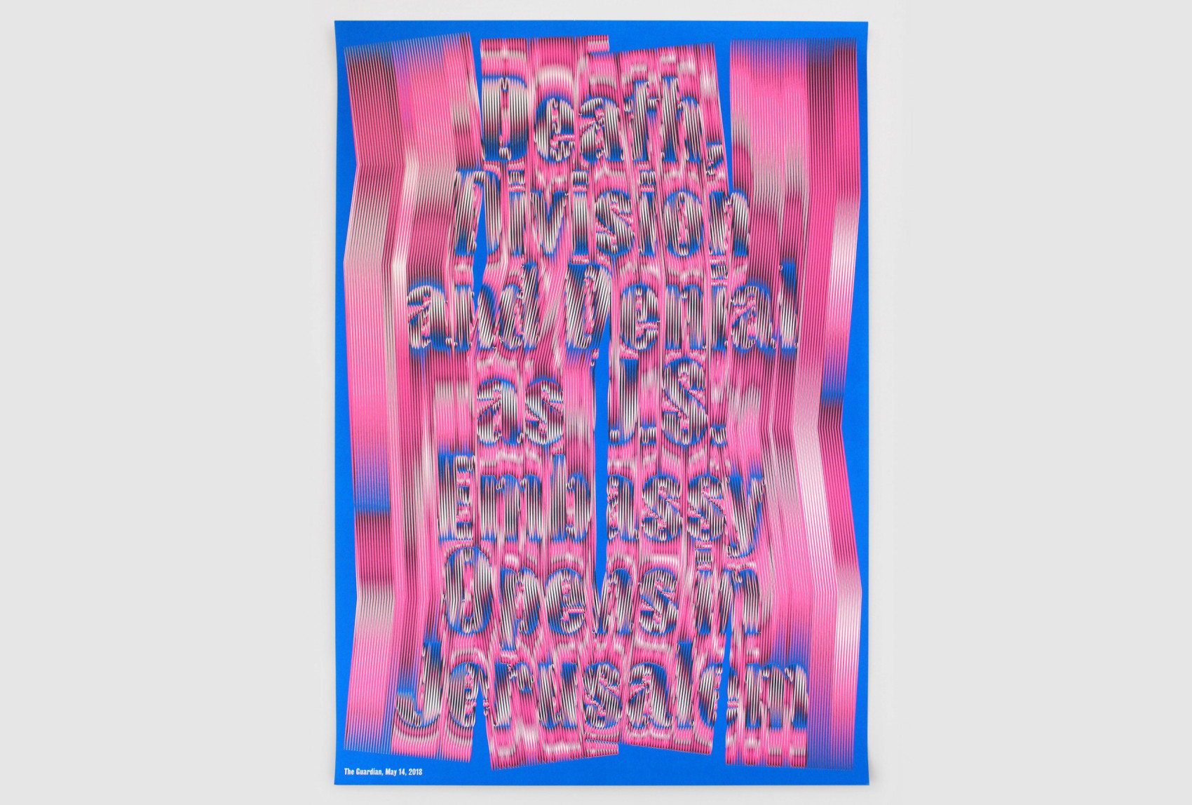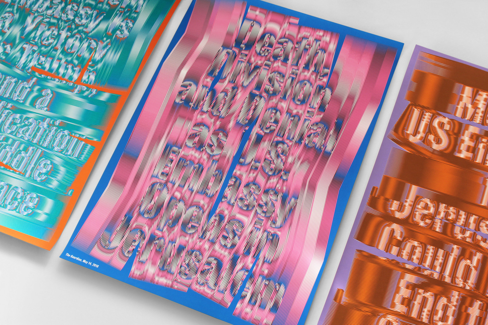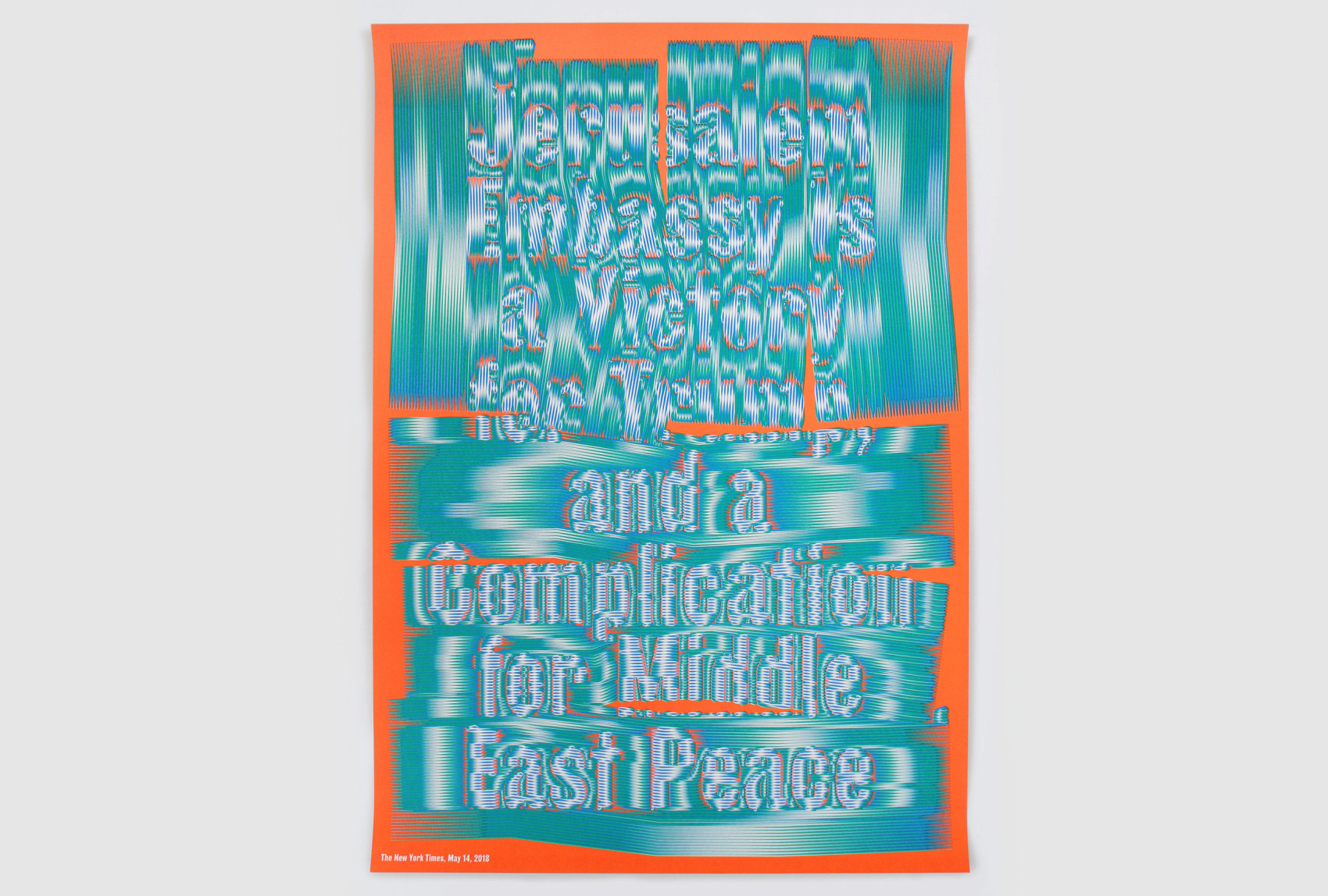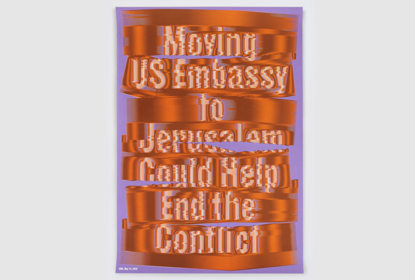 “Truth’s Triptych” is a series of three silkscreen prints examining the 2018 U.S. Embassy move from Tel Aviv to Jerusalem. Each print displays a different news headline from the same day, illustrating the same event through contrasting narratives—ranging from peace to conflict. The series explores how political gestures are interpreted in radically different ways, revealing the parallel realities constructed by media coverage.